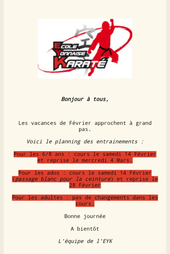7 FEVRIER : salle de l'Angelmière indisponible. Pas de cours ados ni adultes.